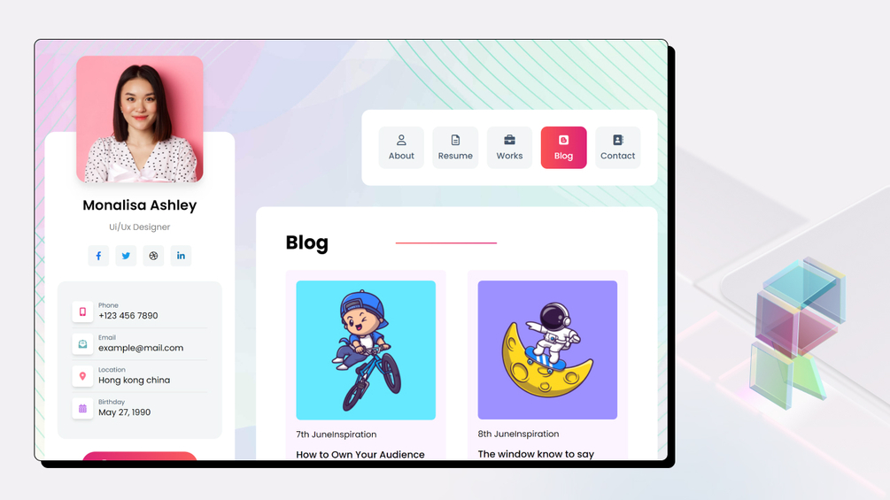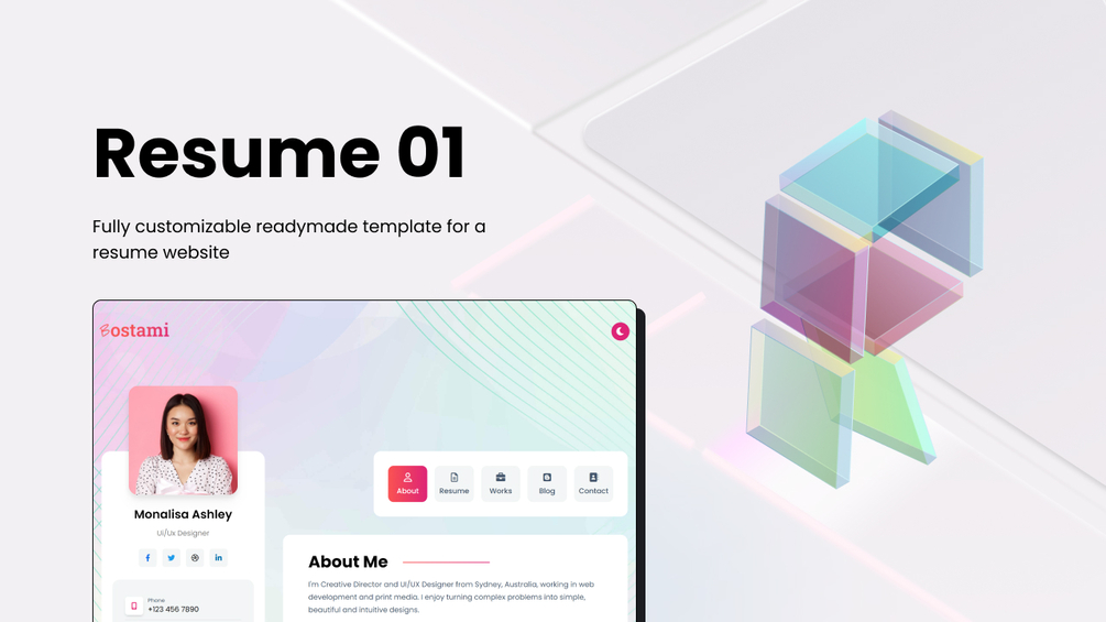 Resume01 is a website template that simplifies the process of developing a website for your resume. It has never been simpler to showcase your website creatively. This template allows you to present your skills and achievements on the Internet with an innovative website for which you do not need to write a single line of code.