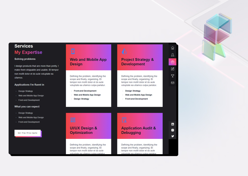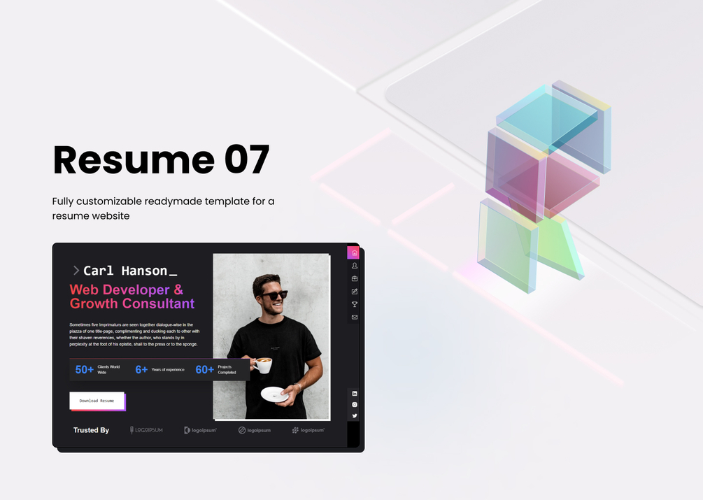 The process of creating a website for your resume can be made easier using Resume07, a website template. Putting your website in a creative light has never been easier. Without writing a single line of code, you can use this template to create an original website that showcases your accomplishments, abilities, and portfolio online.